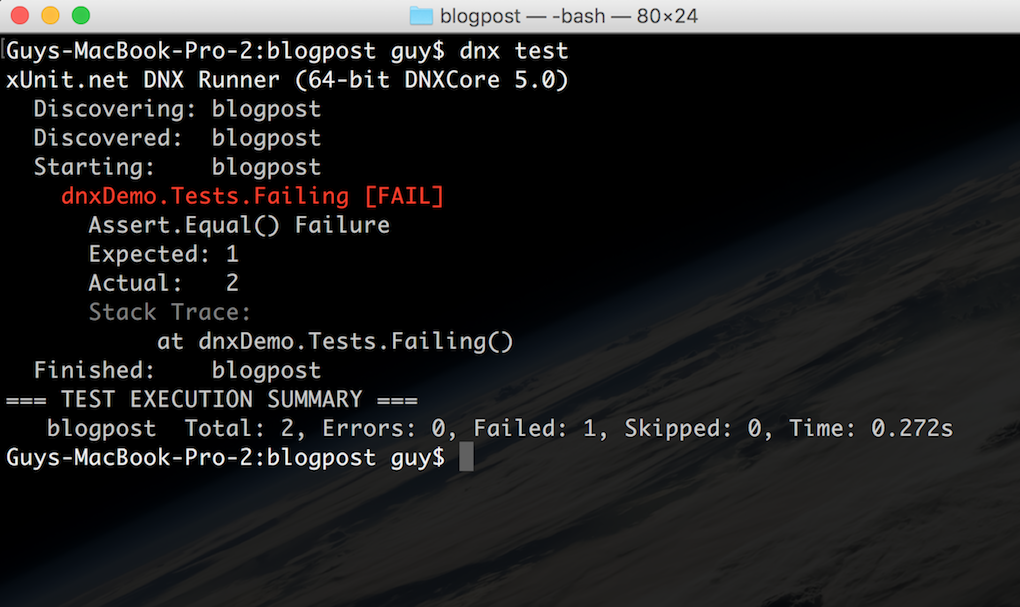 To invoke the command run dnx test and you should get one passing test and one failing test...